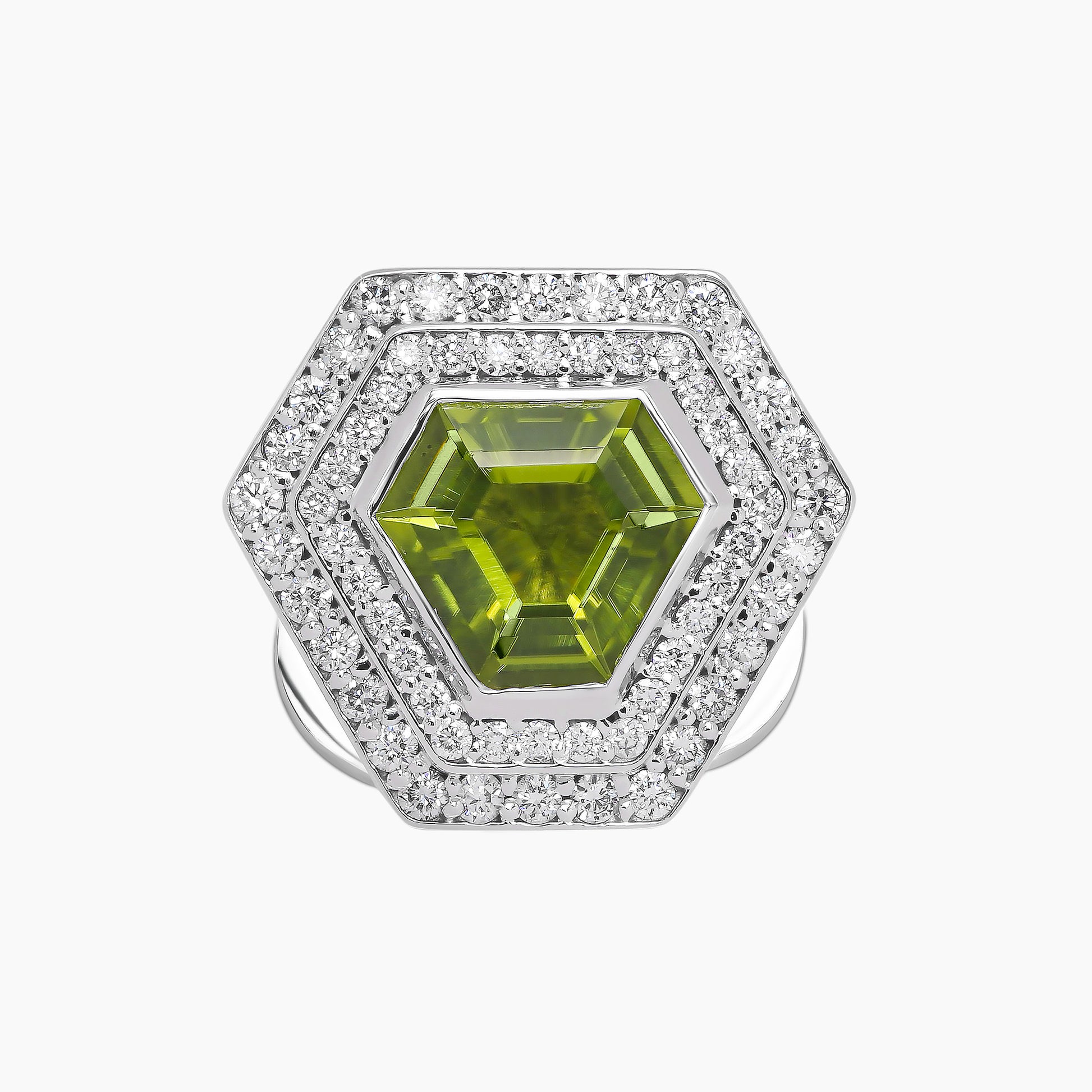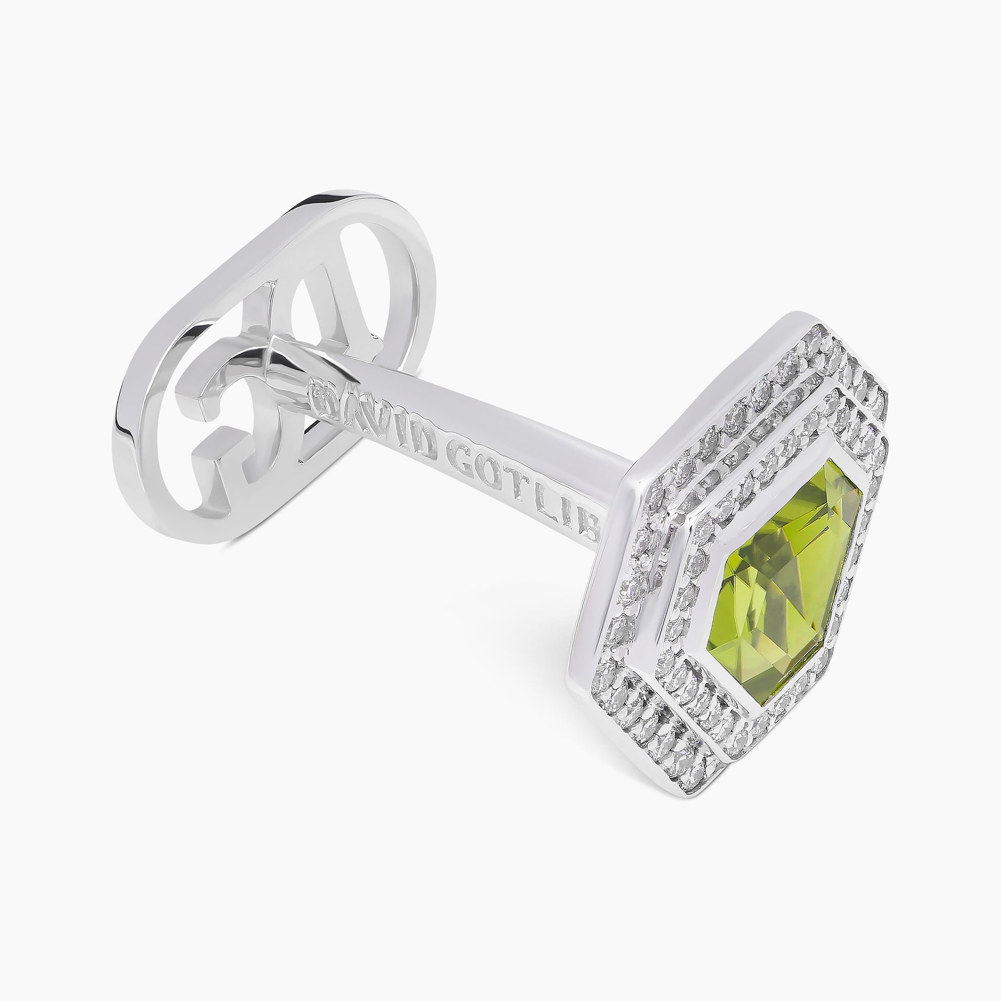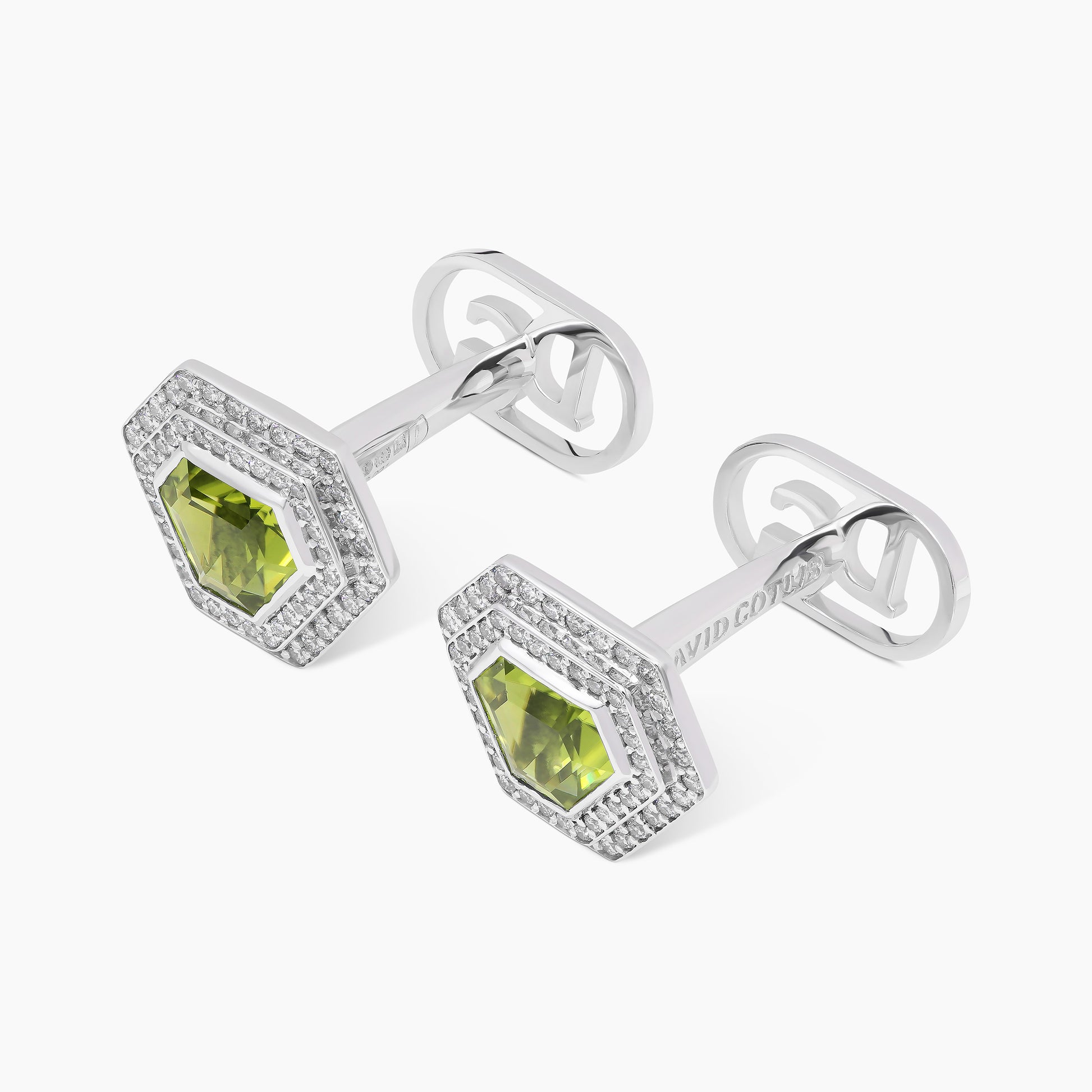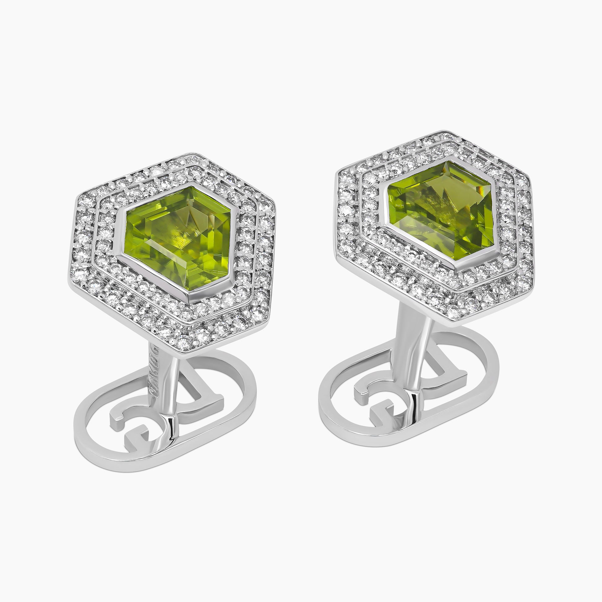 These 18k white gold cufflinks embody a harmonious interplay of light and form, featuring a central peridot surrounded by 126 white diamonds. This arrangement creates a striking architecture of reflection, casting light in multiple directions to enhance the modern, geometric design, bringing to life a piece that radiates sharp sophistication.