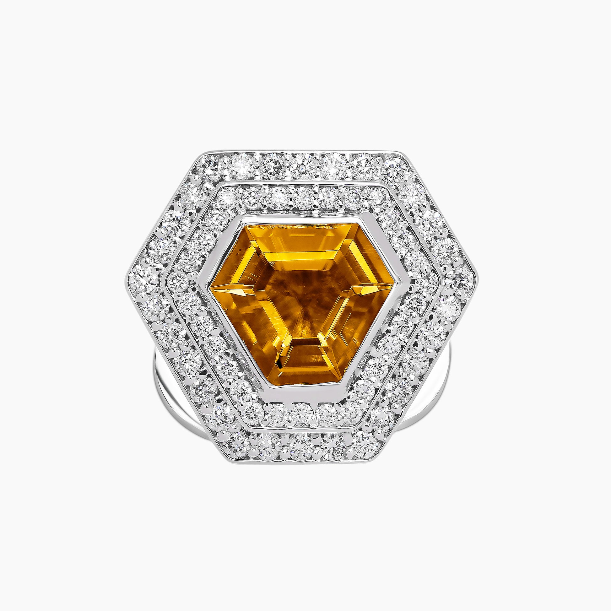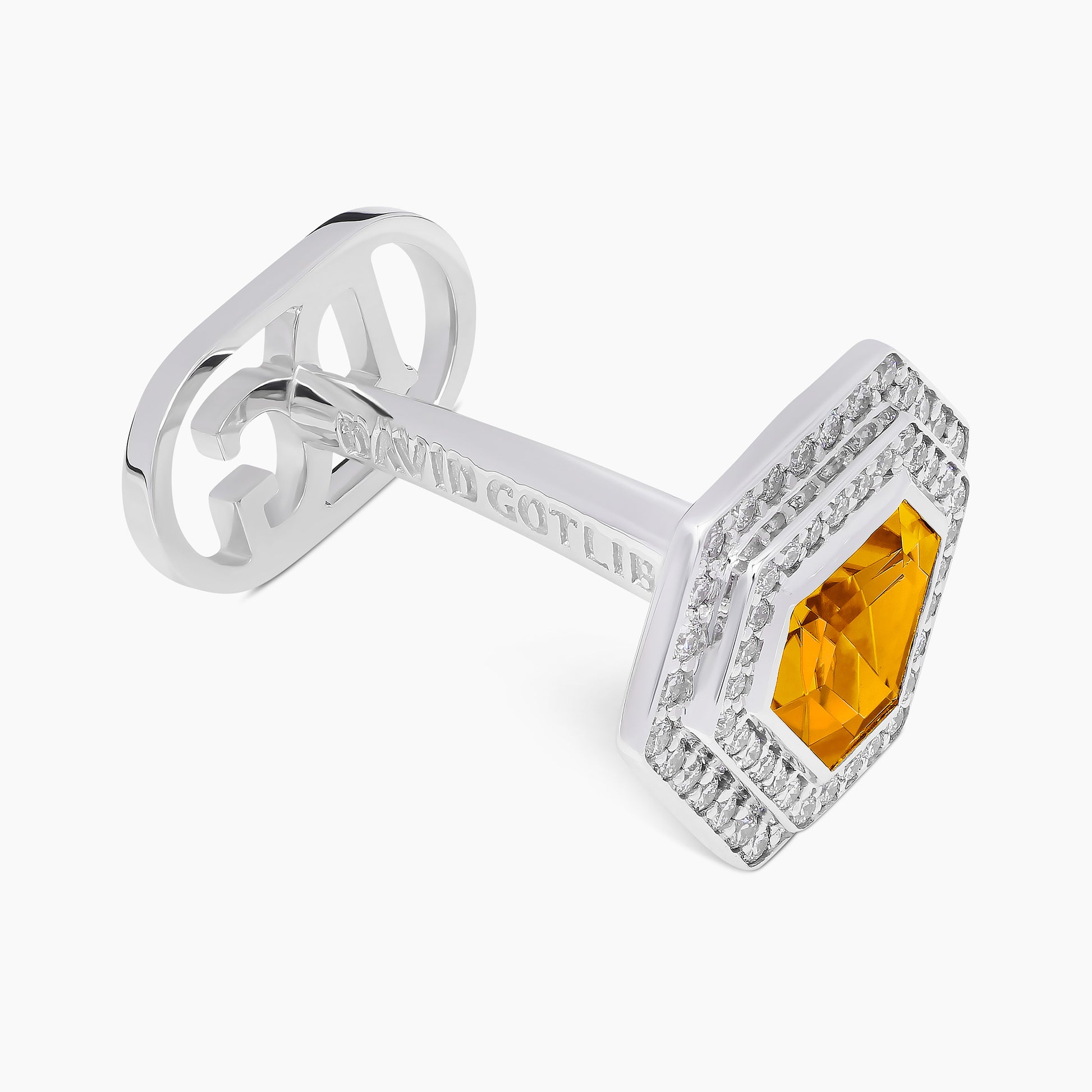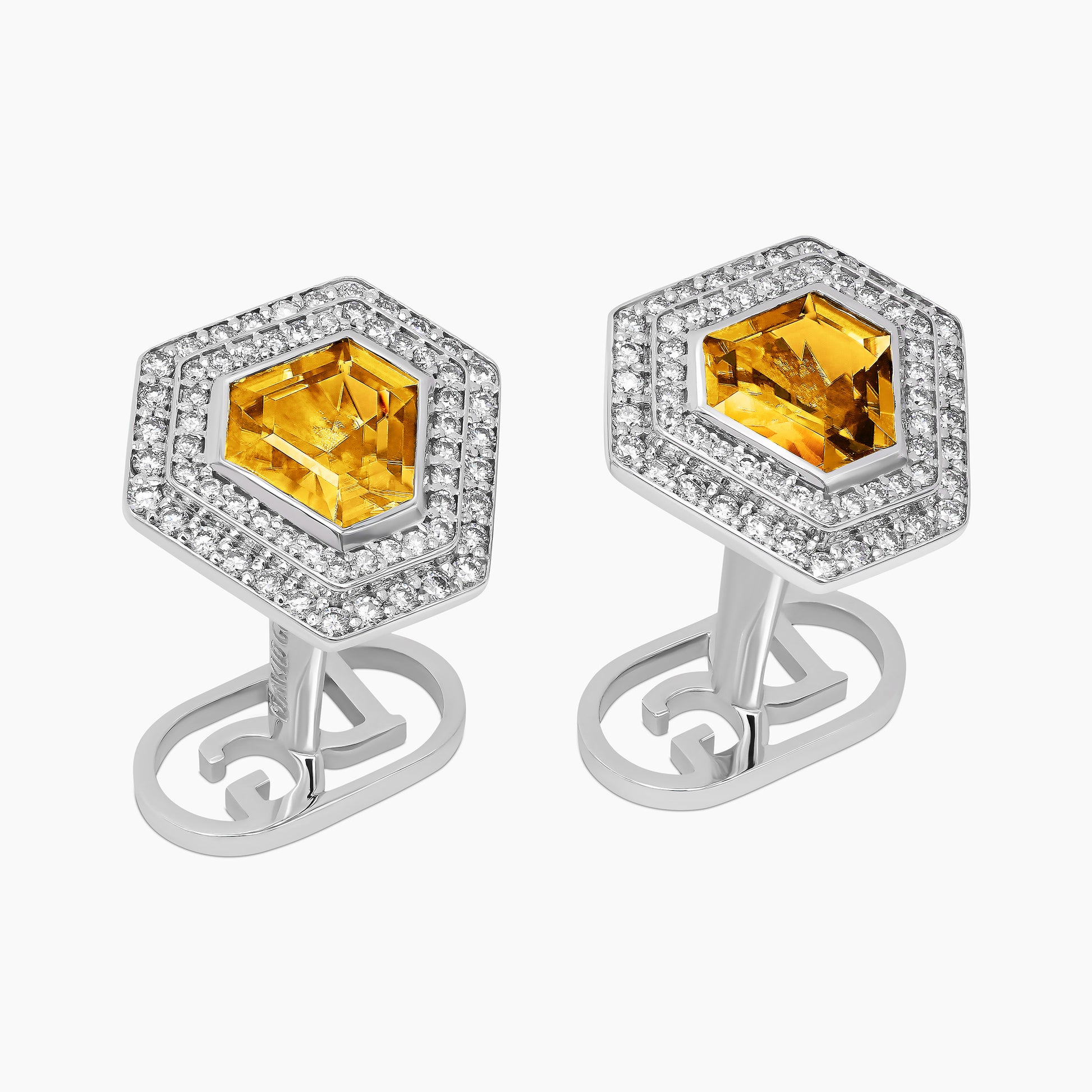 These 18k white gold cufflinks embody a harmonious interplay of light and form, featuring a central colored gemstone surrounded by 126 white diamonds. This arrangement creates a striking architecture of reflection, casting light in multiple directions to enhance the modern, geometric design, bringing to life a piece that radiates sharp sophistication.