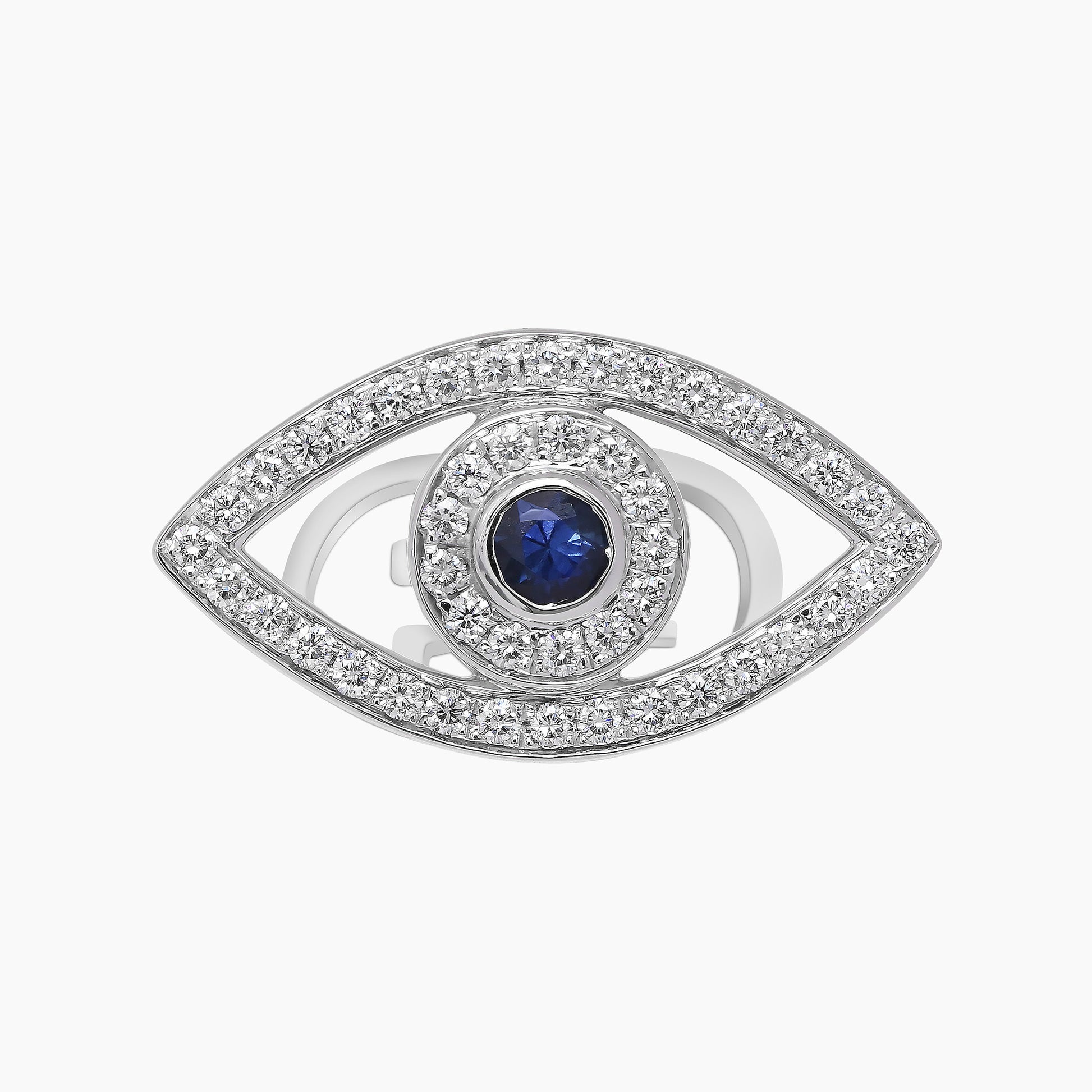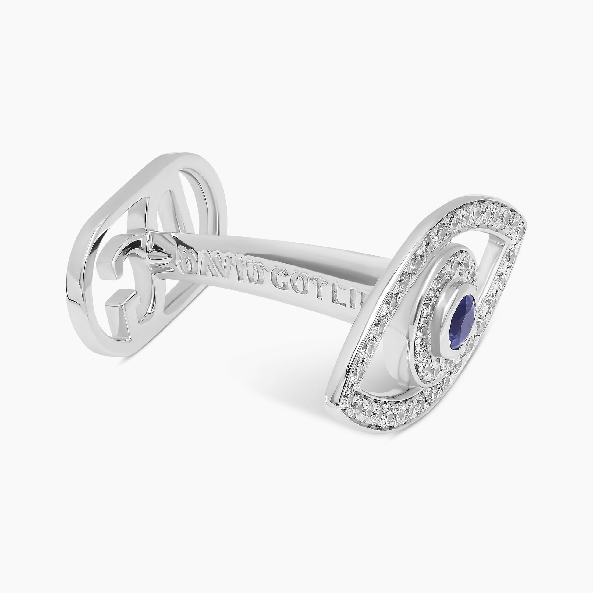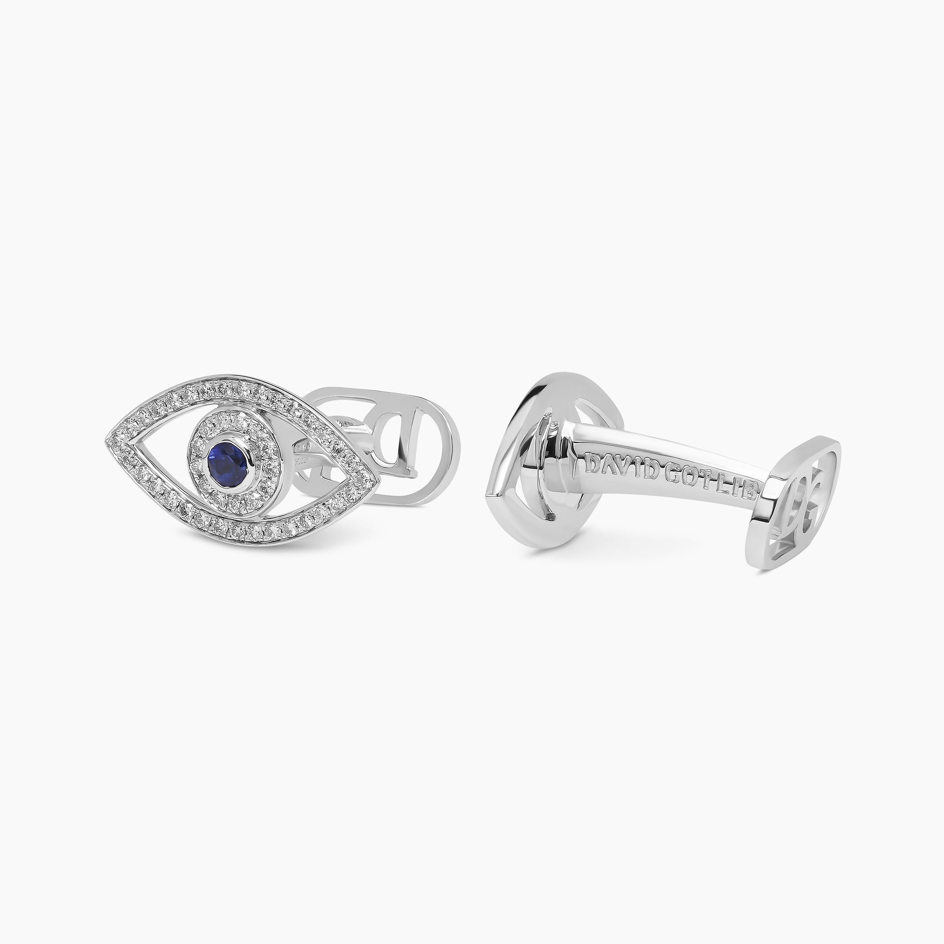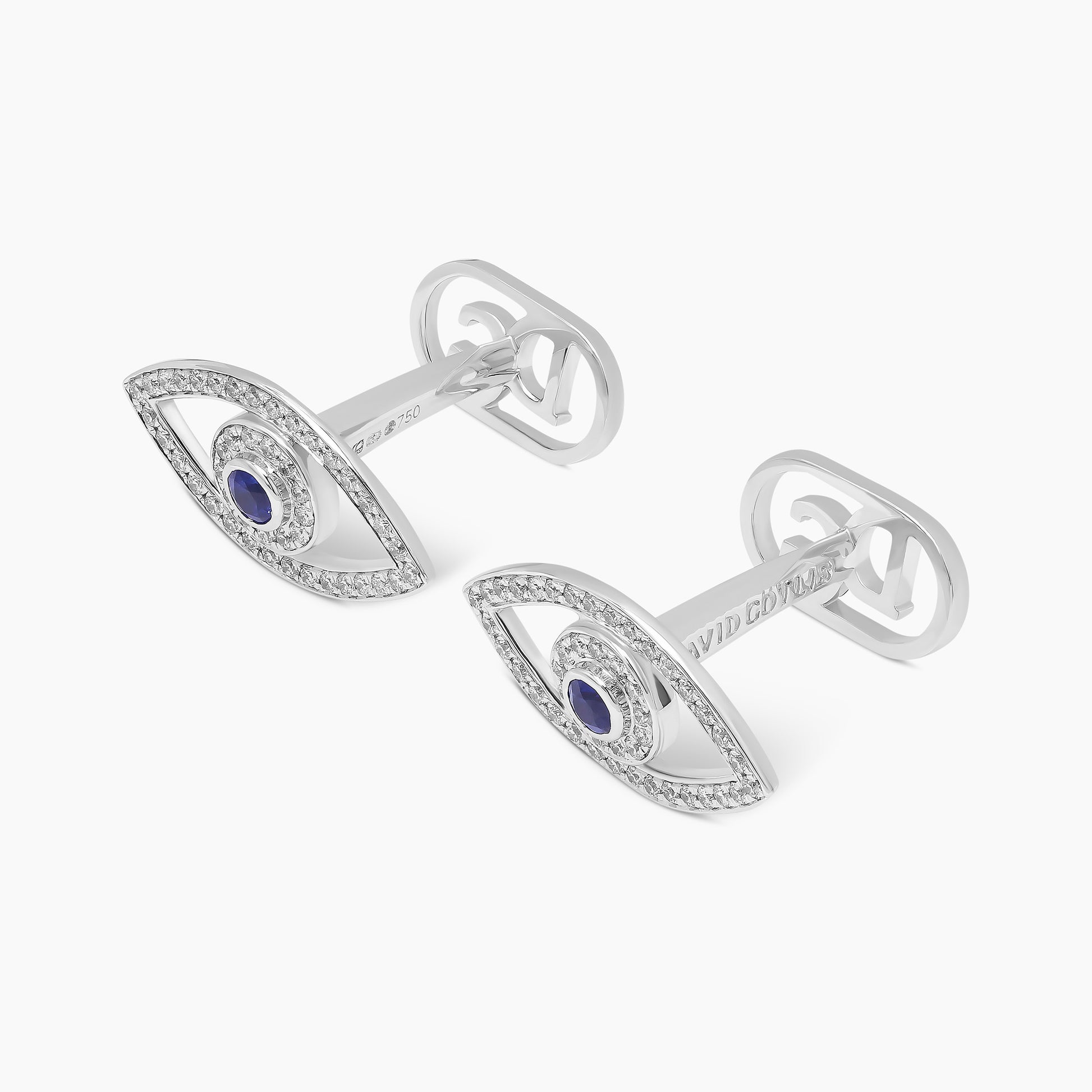Crafted in 18k white gold, these cufflinks feature a sleek lucky eye design, set with 84 white round brilliant diamonds and two deep blue sapphires. A refined symbol of protection, elegance, and charm.