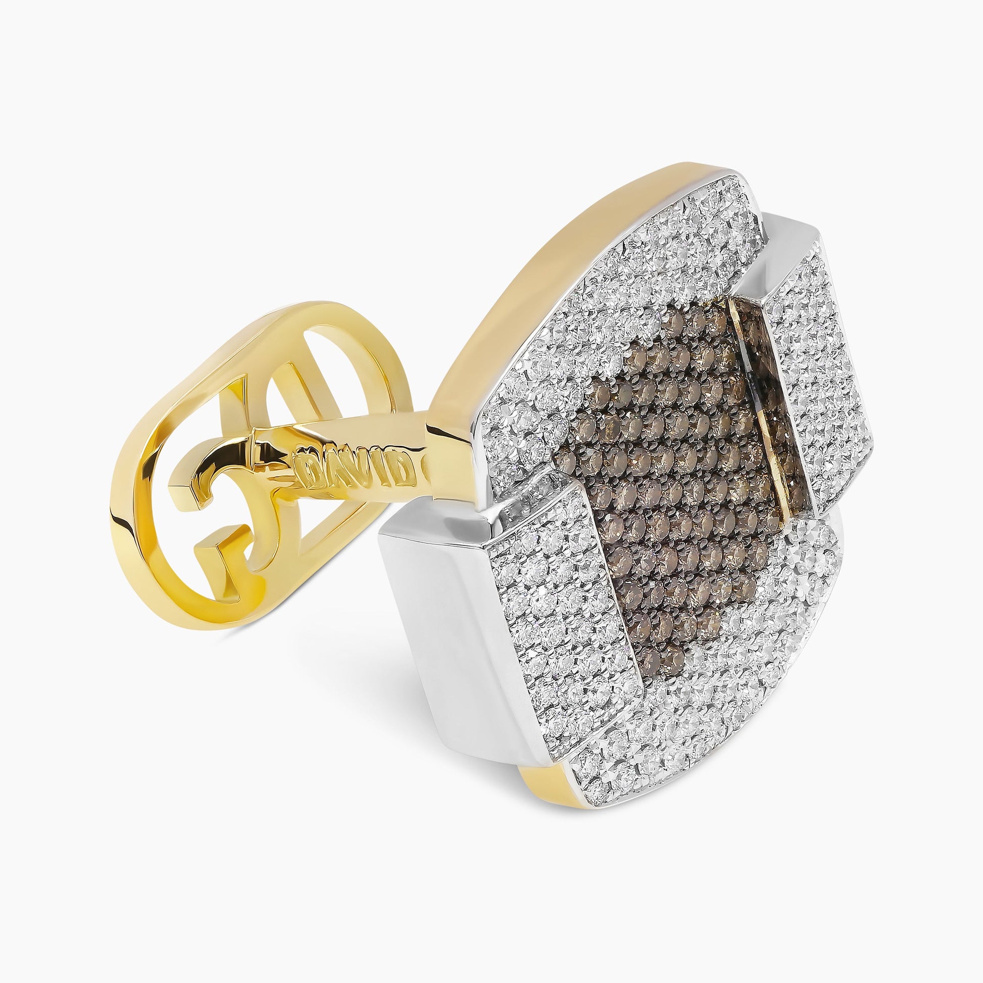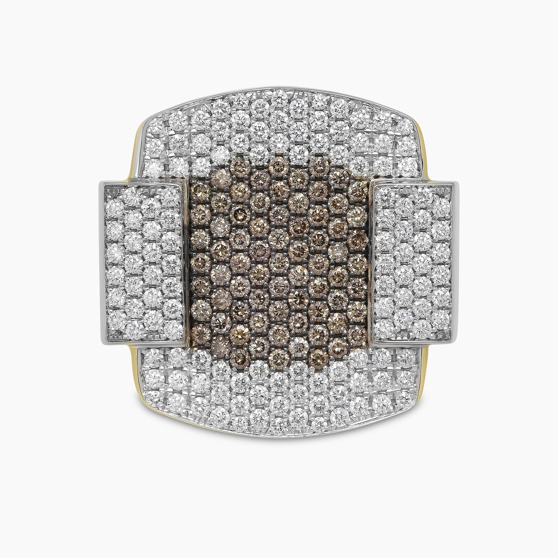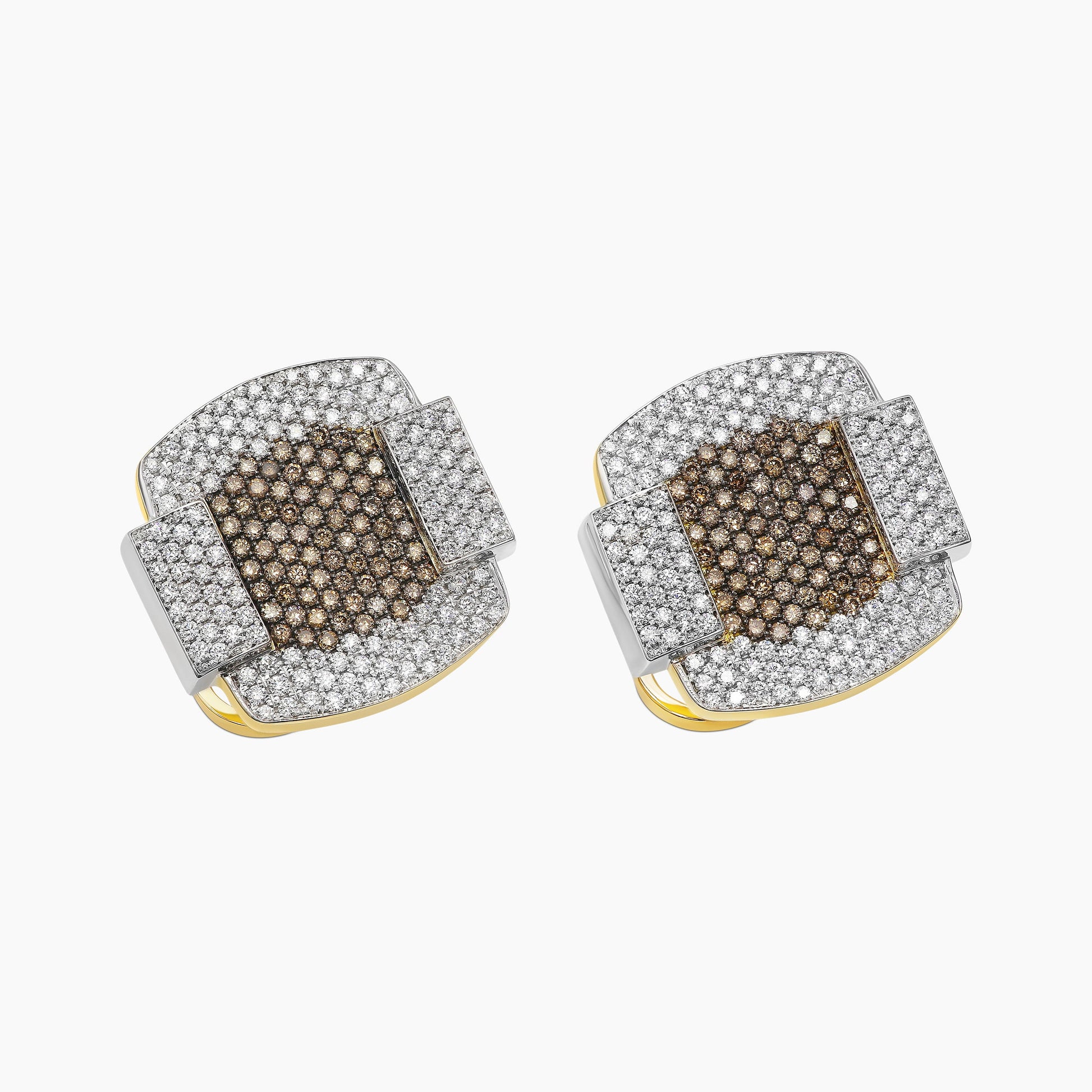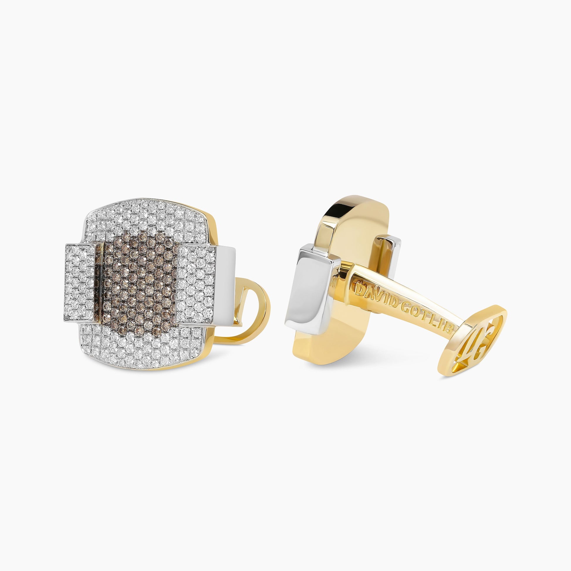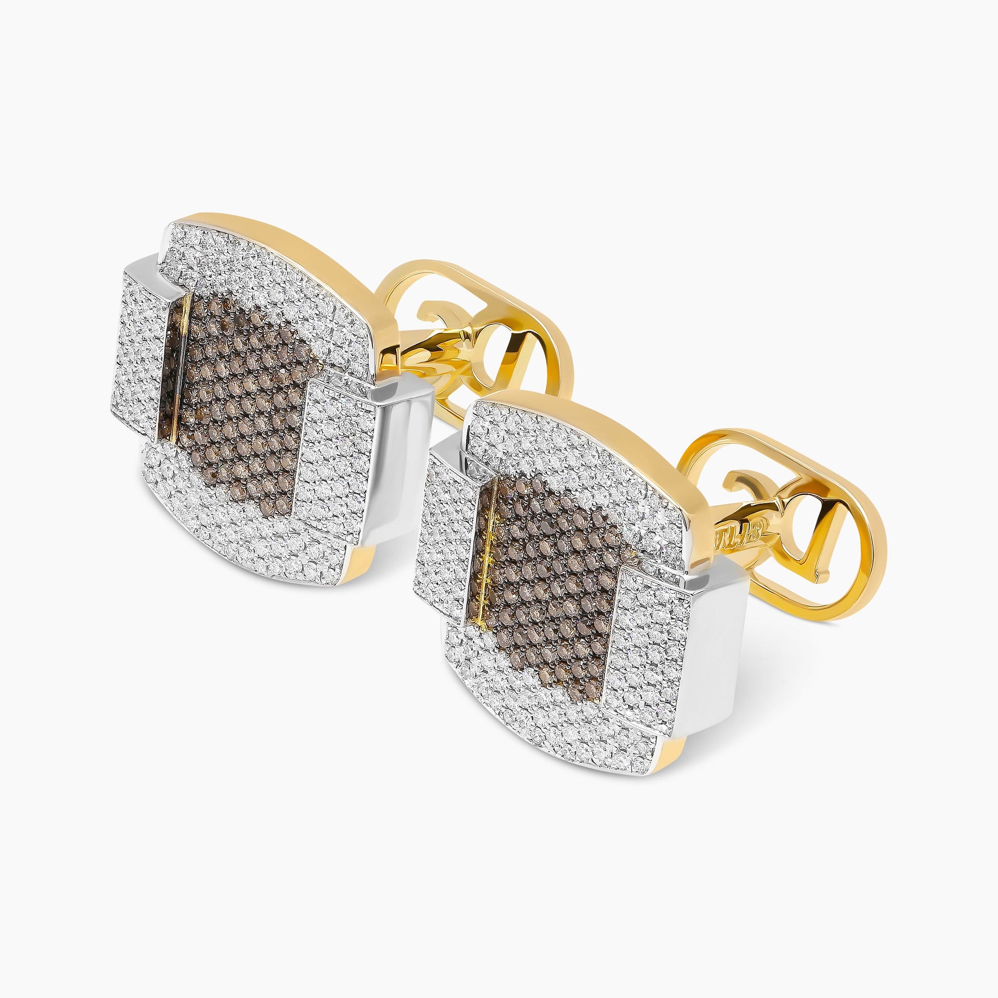 Reminiscent of Art Deco’s balanced proportions and intricate detailing, these cufflinks reflect the elegance and grandeur of this iconic architectural style. Crafted from 18kt gold, they feature a layout of 258 brilliant round white natural diamonds, perfectly balanced with a central motif of 148 brown natural diamonds. With their streamlined, modern design, these cufflinks evoke the timeless sophistication of an era defined by splendor and precision.
