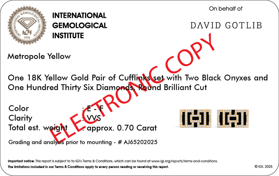 Every pair of cufflinks is delivered in our distinctive premium box, accompanied by its IGI certificate, ensuring unparalleled quality and authenticity.