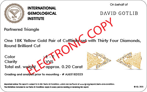 Every pair of cufflinks is delivered in our distinctive premium box, accompanied by its IGI certificate, ensuring unparalleled quality and authenticity.